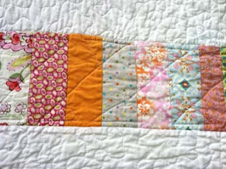 This next quilt I made using the "jelly roll race" method. I cut 2 1/2" strips from a set of FQs from friend and guild-mate Sarah, then stitched them end-to-end, folding and stitching til it was quilt-shaped. I FMQed it in alternating blocks of straight lines.